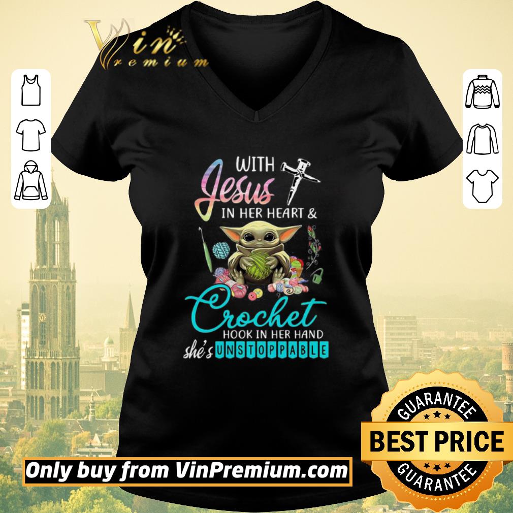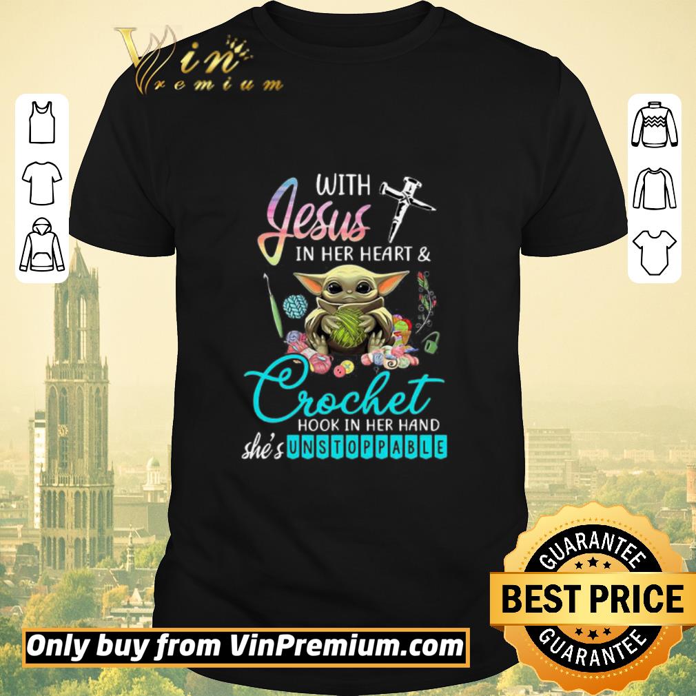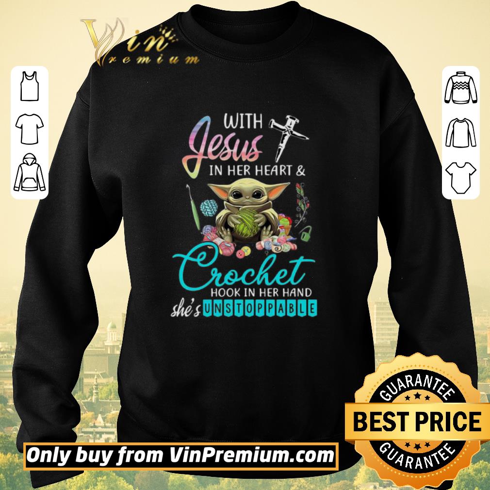 Premium Baby yoda with jesus in her heart and crochet hook in her hand she’s unstoppable shirt sweater, Hoodie, Sweater, Longsleeve T-Shirt For Men and Women